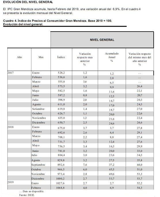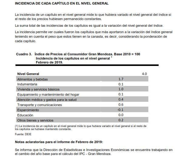 Impulsada por los aumentos en Alimentos y en Vivienda y servicios Básicos, la inflación de febrero en Mendoza alcanzó el 4%, según los datos del Gobierno provincial.