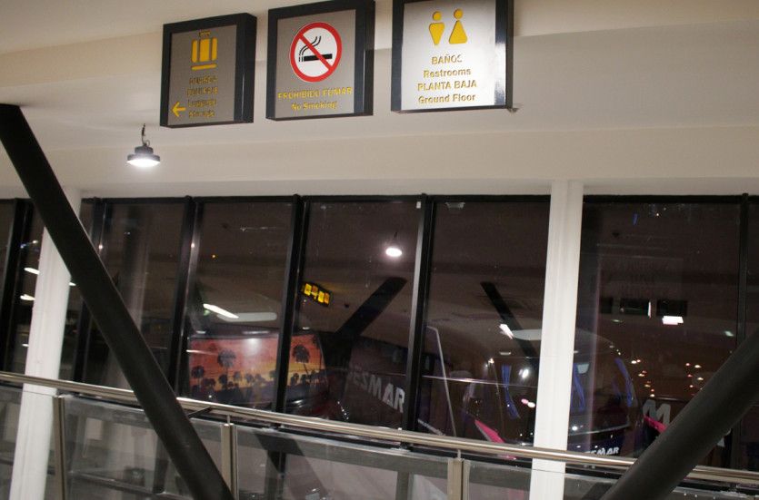Desde calle Reconquista -continuación de Alem y de Bandera de los Andes- se observa la entrada principal muy iluminada que evidencia la impronta moderna del proyecto. Una vez dentro, la sensación de estar en otra estación de ómnibus se hace inevitable.