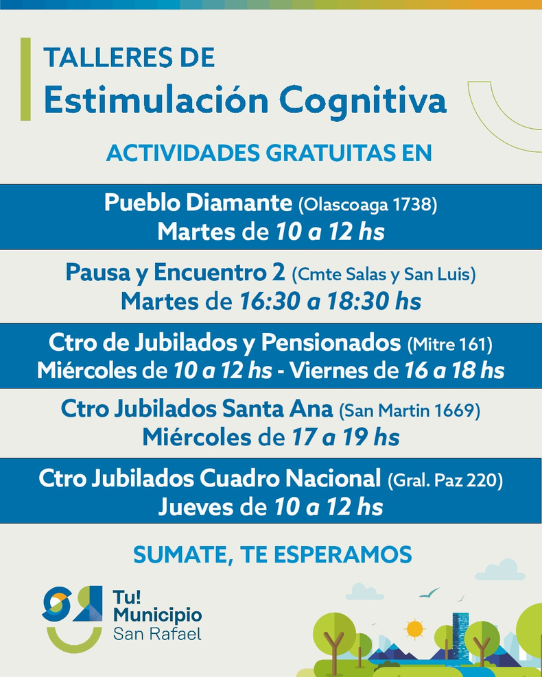 Con el objetivo de mejorar la calidad de vida de los adultos mayores, el Municipio de San Rafael viene trabajando en diferentes talleres y propuestas lúdicas, recreativas y deportivas. Una de ellas son los Talleres de Estimulación Cognitiva, espacios donde se llevan a cabo distintas actividades diseñadas para fortalecer la memoria, la atención y el razonamiento, ayudando a prevenir el deterioro cognitivo y fomentando el encuentro social.