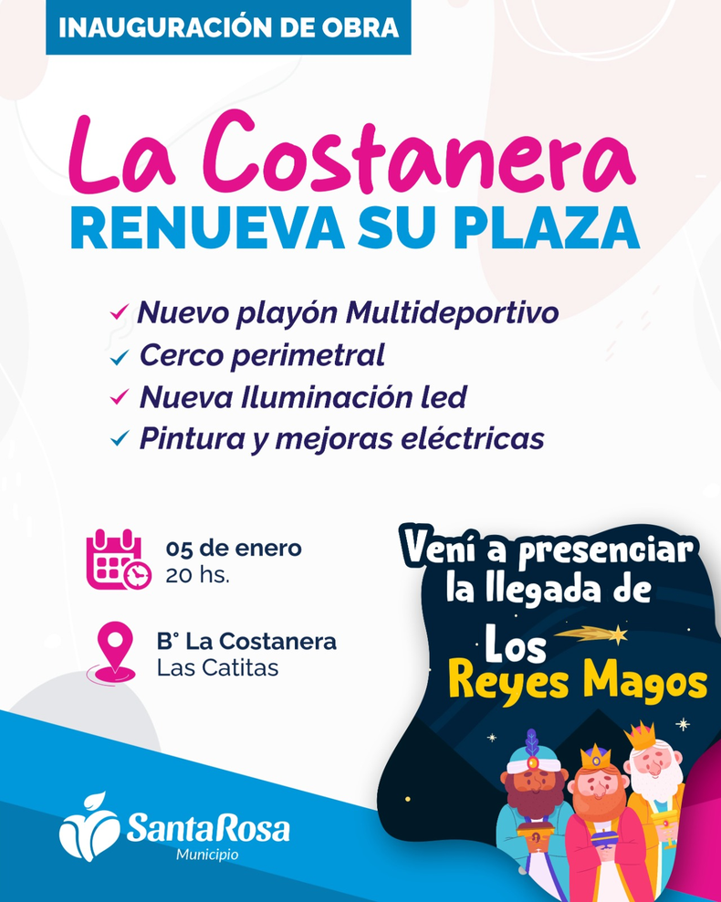 Este domingo 5 de enero a las 20.00 horas, los vecinos de Las Catitas en el departamento de Santa Rosa, están invitados a la inauguración de las renovaciones en la plaza La Costanera, un espacio que se transforma para el disfrute de toda la comunidad.