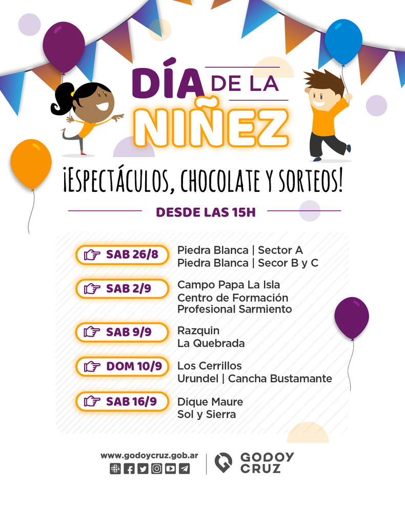 La propuesta por el Día del Niño recorrerá diez lugares con entretenidos espectáculos. Entonces, Porotita y Tatán, Historias de Lluvia y Nonna Burbujas, celebrarán junto a niños y niñas esta fecha tan especial. Estos festejos desde la Municipalidad de Godoy Cruz se prolongarán desde el 26 de agosto hasta el 16 de septiembre, todos los sábados y domingos, desde las 15.