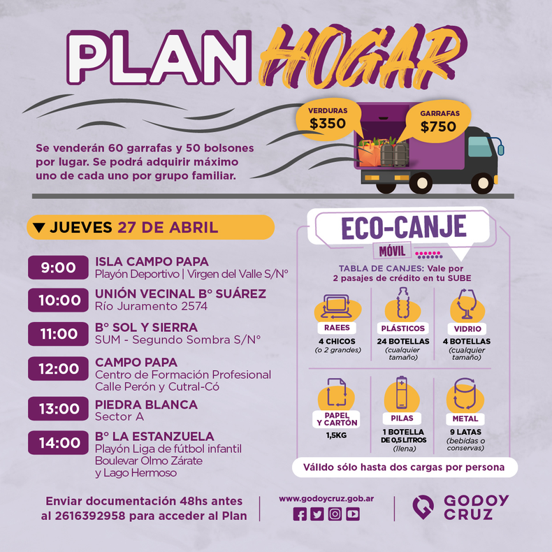 El Plan Hogar recorre diferentes barrios del departamento de Godoy Cruz desde hace 20 días. Cada grupo familiar puede adquirir sólo una unidad por cada producto puesto . Vale destacar que para retirarlo deberán solicitar turno con la documentación, sin excepción.