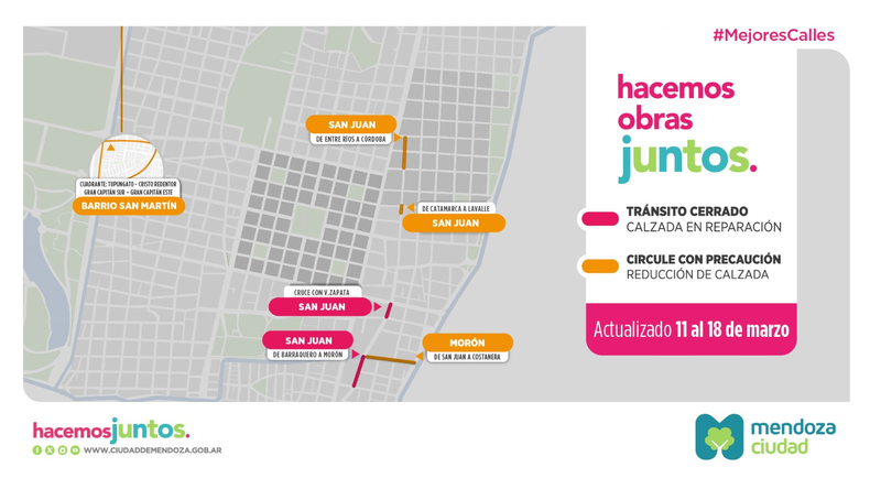 La Municipalidad de Mendoza comunica los cortes de arterias, en forma total o parcial, de cada calle que se están interviniendo. En este sentido, se informan las restricciones por efectuarse obras en calzada o en veredas. Estos trabajos están incluidos en el Plan de Obras que la comuna lleva adelante para brindar mejores condiciones de transitabilidad vehicular.