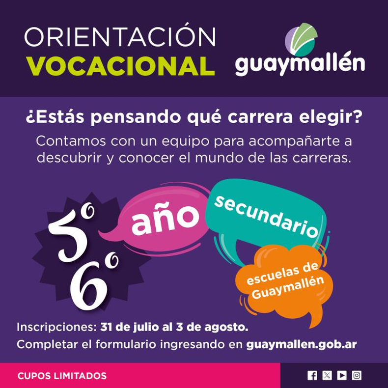 La Municipalidad de Guaymallén invita a sumarse al programa de orientación vocacional, destinado a alumnos de 5.º y 6.º año (en caso de colegios técnicos) de secundaria de escuelas de Guaymallén. Los interesados podrán inscribirse desde el lunes 31 de julio hasta el jueves 3 de agosto inclusive, completando con sus datos el siguiente formulario: https://docs.google.com/forms/d/e/1FAIpQLSfa_b7NPZhWc_4cjWUKd__ZcFMX5VktxO7ylcFgNsyLQ-OZ8w/viewform. Los cupos para las inscripciones son de cáracter limitados.