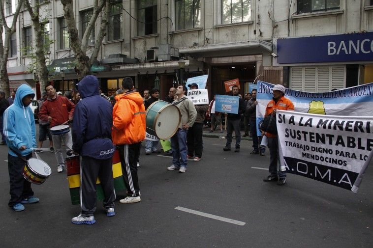 Mientras el Gobierno presenta los proyectos mineros de Cerro Amarillo y Hierro Indio en el Senado, manifestantes a favor de la minería cortan calle Gutiérrez y 9 de Julio.