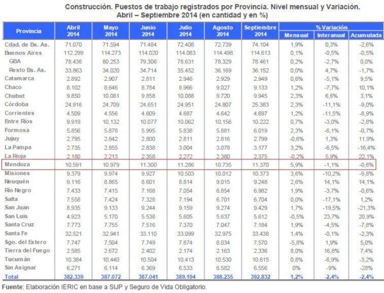 Según datos del Instituto de Estadística y Registro de la Industria de la Construcción (IERIC), en septiembre el nivel de empleo formal en la construcción de Mendoza creció un 5,9% en relación a agosto, ubicándose junto con Tierra del Fuego (donde el empleo en el sector aumentó un 8%) como las dos provincias donde más se recuperaron puestos de trabajo en la construcción.