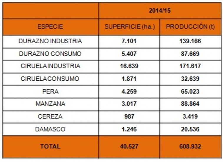 Según informó el IDR, este es el total de hectáreas en producción y las principales variedades de fruta con su pronóstico de cosecha para 2014/2015: