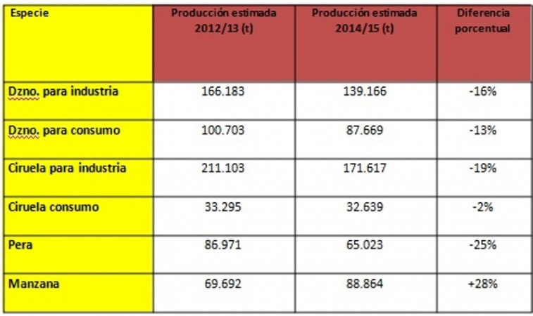 En el análisis por variedades, la comparación entre el pronóstico de cosecha 2014/2015 contra la campaña 2012/2013 marca caídas generalizadas en la producción, salvo en el caso de la manzana, que registra un crecimiento del 28%. Para el durazno en fresco se espera una caída del 13% y del 16% en el caso del de industria; para la ciruela en fresco se estima una baja del 19% y del 2% para consumo en fresco; mientras que para la pera se estima una caída del 25%.