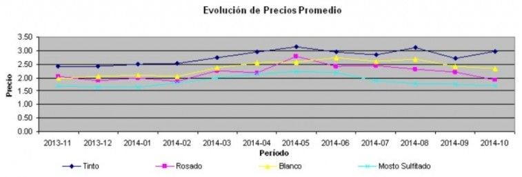 Tomando en cuenta el vino tinto promedio, en noviembre de 2014 se comercializó a $2,81 el litro, esto es un 11,06% en relación a los $2,53 que se pagaban en noviembre de 2012; y un 11,6% en relación a los $2,41 por litro de vino tinto pagados en noviembre de 2013, según datos de la Bolsa de Comercio.