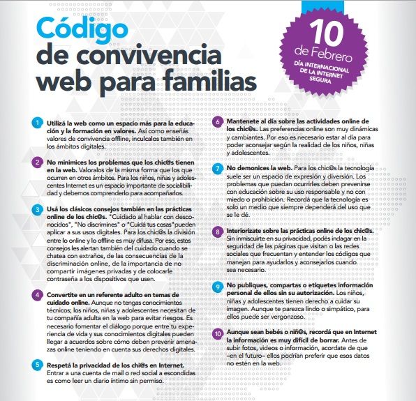 Se trata de un Código de Convivencia web para las familias elaborado por el Ministerio de Justicia y Derechos Humanos en conjunto con Unicef Argentina, que fue difundido hoy por conmemorarse el "Día Internacional de la Internet Segura".