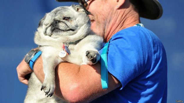 Otro de los participantes, Grove, en brazos de su dueño Jim Partridge, en un momento de la competición. Los perros son juzgados no sólo por las primeras impresiones del jurado en cuanto a su físico, sino también por su personalidad y actitud.