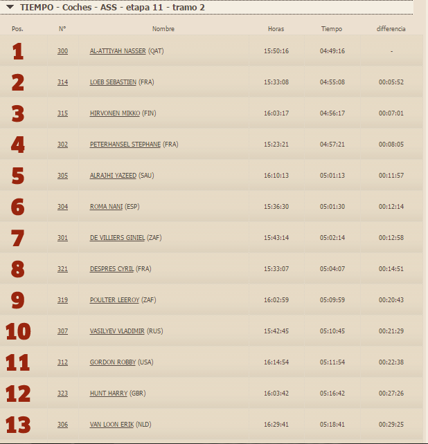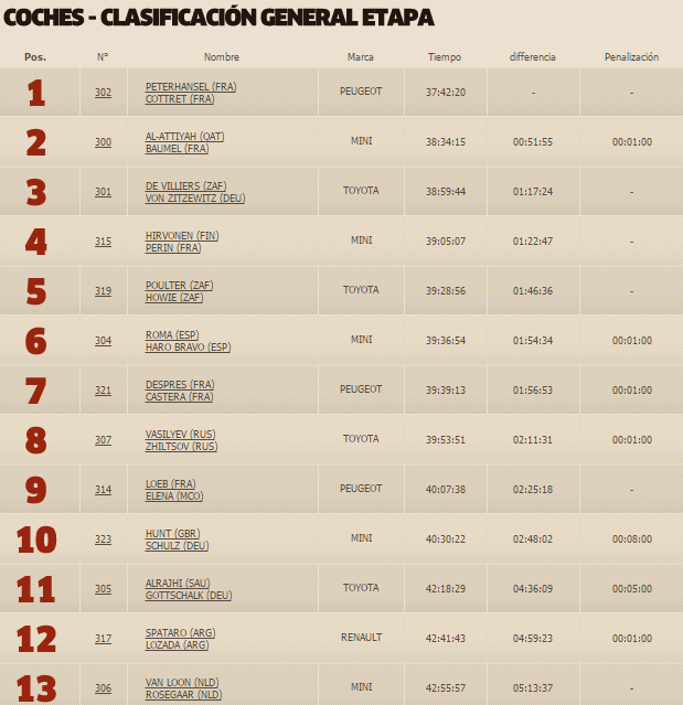 De esta manera, Peterhansel acaricia una nueva victoria de la competencia con su Peugeot, al tener una ventaja de casi 52 minutos sobre Al Attiyah. En tercer lugar se ubica el sudafricano Giniel De Villiers, con su Toyota, a una hora y 17 minutos.