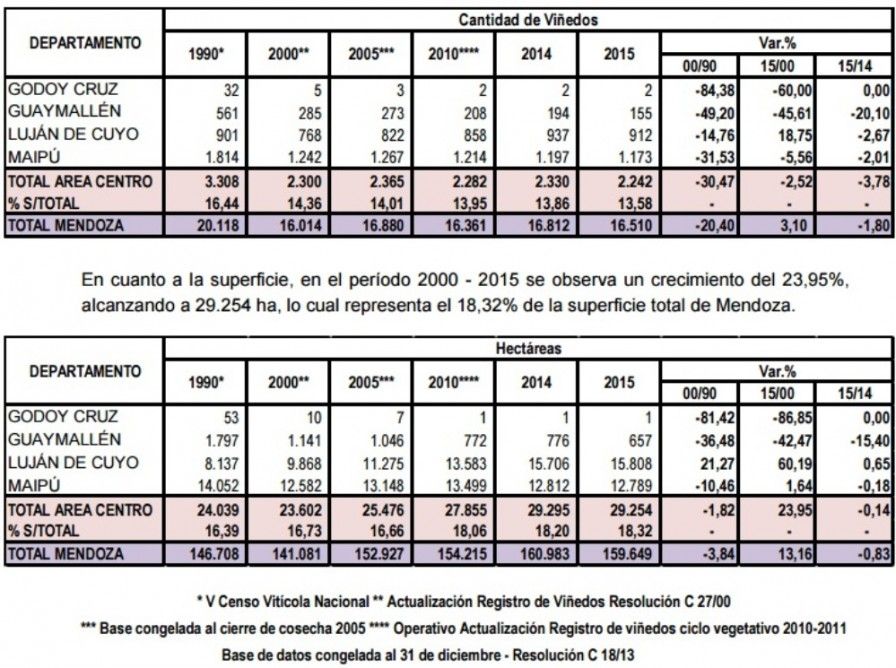 Según un informe sobre la Zona Centro de la Vitivinicultura de Mendoza del INV, la superficie cultivada con viñedos en el territorio comprendido entre Godoy Cruz, Guaymallén, Maipú y Luján creció entre 1990 y 2015 un 8,8%, al pasar de 146.708 a 159.649 hectáreas. Y la principal razón que explica este crecimiento está en Luján, donde el crecimiento en la superficie cultivada con vides creció un 94,3% en los últimos 15 años, mientras que en el resto de los departamentos de la Zona Centro hubo fuertes caídas.