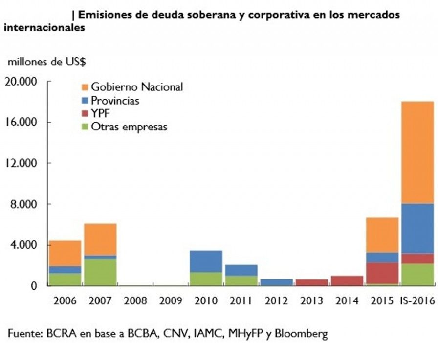 Según explica el propio Banco Central, las colocaciones corporativas y soberanas en el exterior se dinamizaron en forma marcada: en el primer semestre del 2016 el monto de emisiones se constituyó en un máximo de al menos los últimos 10 años. Se destacaron por su magnitud las colocaciones del Tesoro Nacional (en torno a los U$S10.000 millones netos de las compensaciones por acuerdos con holdouts) y de algunos provincias y, por el lado de los privados, las de empresas como YPF, Cable visión, Arcor e IRSA, entre otras.
