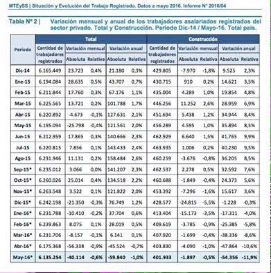 El gráfico oficial del propio Ministerio admite que la creación de puestos de trabajo registrados fue permanente hasta noviembre del año pasado -demostrando así la mentira del discurso de campaña y de estos primeros meses- y comienza a caer sin parar, cada vez más profundamente desde Diciembre de 2015. En total según la cifra oficial entre noviembre y junio se perdieron 128.294 puestos de trabajo registrados con el arrastre que eso tiene, también, sobre el empleo informal cosa difícil de calcular.