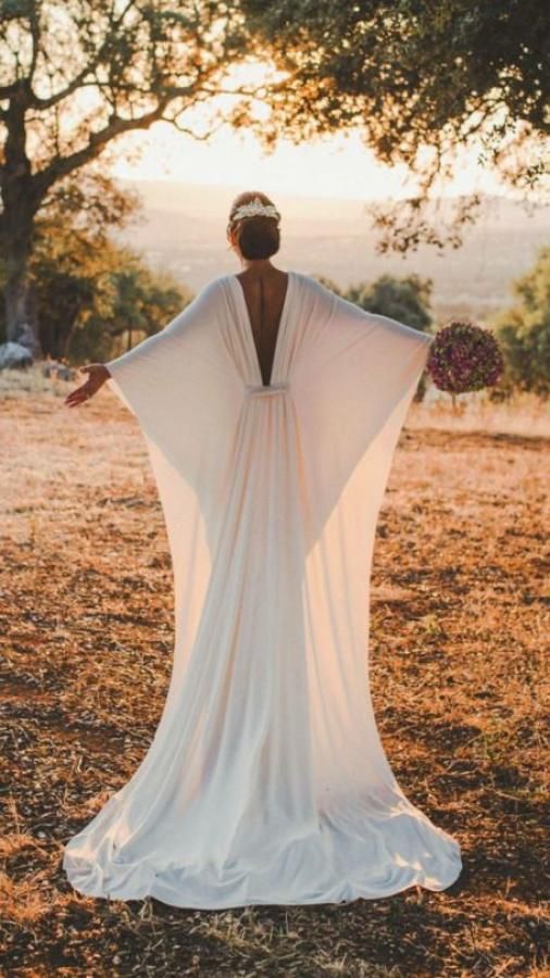 Este vestido tiene reminiscencias greco-romanas. Para novias audaces y con buena espalda.