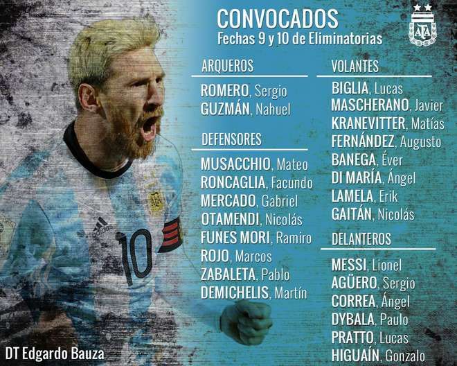 La siguiente es la lista de jugadores convocados del seleccionado argentino de fútbol para los partidos ante Perú y Paraguay, por las Eliminatorias Sudamericanas rumbo al Mundial de Rusia 2018.