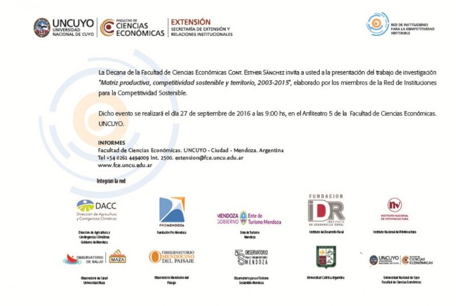 Se trata de la `Matriz Productiva, Competitividad Sostenible y Territorio 2003-2015, que compone el sexto documento de la serie "Diagnóstico y Perspectivas Regionales", que elabora anualmente la Red de Instituciones para la Competitividad Sostenible (Reicos). La cita es mañana en la UNCuyo.