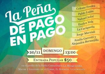 13.00 - 1º Peña de Pago en Pago. Artistas de la cultura popular: Alejandra Bermejillo y Analía Garcetti, Evelyn Vela, Jorge Marziali, Nahuel Jofre, Pablo Luján Autor, La Caciqueña Murga y Celeste Fredes. En el predio de la Radio Comunitaria "La Mosquitera". Maure y Lisandro de la Torre, El Bermejo, Guaymallén.