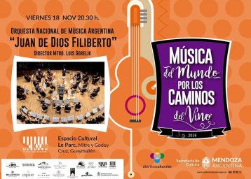 20.30 - Música del Mundo por los Caminos del Vino. Artistas: Orquesta Nacional de Música Argentina "Juan de Dios Filiberto"; solista invitada: Patricia Cangemi. Espacio Cultural "Julio Le Parc", Mitre y Godoy Cruz, San José. Guaymallén.