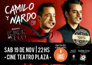 22.00 - Camilo y Nardo presentan: "Humor en seco". Vuelven a Mendoza los humoristas cordobeses ganadores del premio Carlos 2016 a Mejor Stand Up. Teatro Plaza. Colón 27, Godoy Cruz. Entrada: $170.
