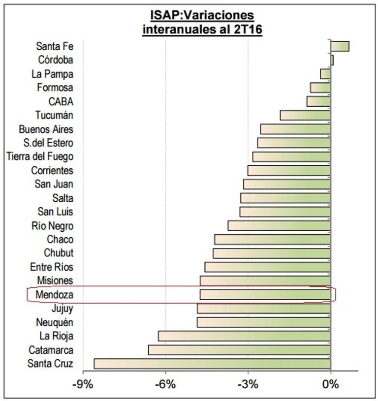 Según datos del último informe del Indicador Sintético de Actividad de las Provincias (ISAP) de la consultora Federico Muñoz y Asociados, Mendoza cerró al segundo trimestre de 2016 su tercer trimestre seguido de caída en su economía. Con esto acumula una retracción en su nivel de actividad del 4,8% sólo en el último año.