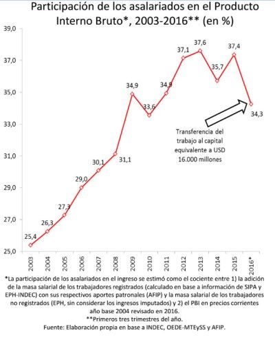 Un trabajo del Centro de Investigación y Formación de la República Argentina (CIFRA) marca que la participación de los asalariados en el PBI cayó del 37,4% al 34,3%. La pérdida de estos tres puntos de participación "equivale a una apropiación por parte del capital de 16 mil millones de dólares" que antes iban a los bolsillos de los trabajadores y al consumo.