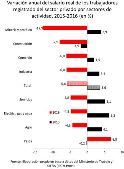 La mayor pérdida se dio en los trabajadores mineros -justamente una de las actividades con mayor rentabilidad- y el petróleo -12,9% en ambos casos. Lo sigue la construcción -7,9%, el comercio -6,0% y la industria -6,0%. El caso del agro es quizás el mejor ejemplo que el aumento de la rentabilidad del sector no garantiza mejoras en el ingreso de los trabajadores. Aquí la caída del salario fue del 4,3%.