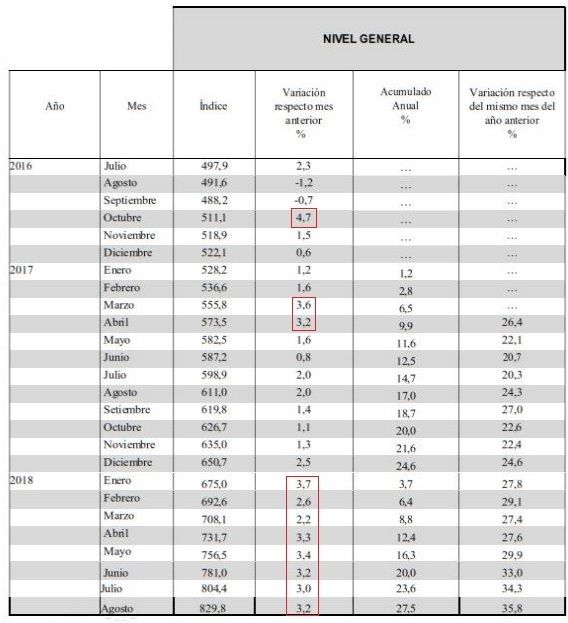 A este ritmo, es que entonces la tasa de inflación anualizada (12 meses acumulados) saltó del 24,3% en agosto de 2017 al actual 35,8%. Esto es más de 11 puntos porcentuales.