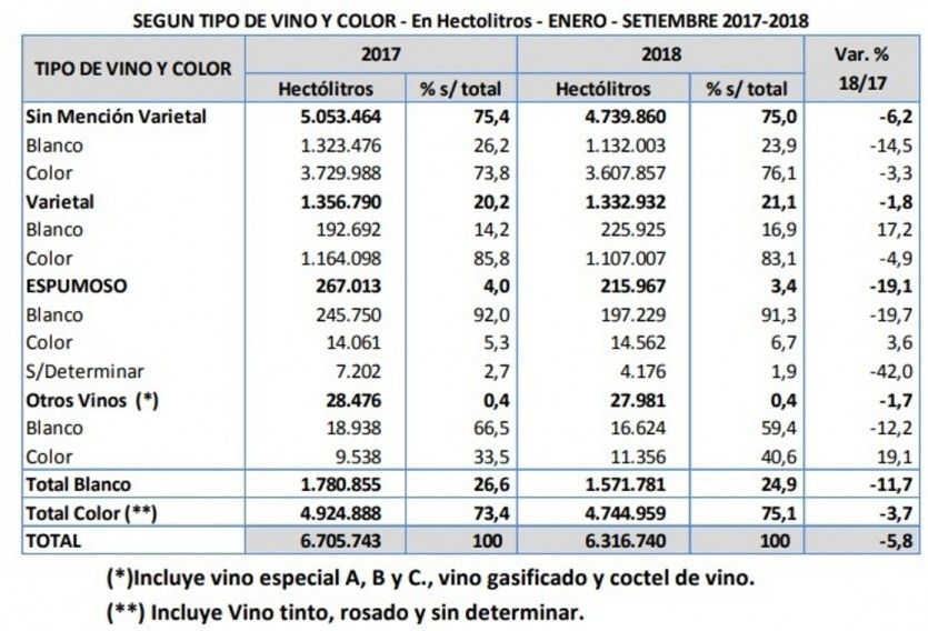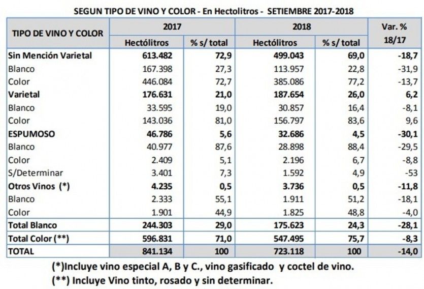 Las ventas de vino al mercado interno siguen en caída libre y no hay luz al final del túnel. En septiembre las bodegas despacharon vinos al consumo interno por un total de 723.118 hectolitros, esto es un 14% menos que los 841.134 de igual mes de 2017. Los blancos registraron una caída del 28,1% en volumen mientras que los de color (tintos y rosados) caen 8,3%. La venta de espumosos cae en septiembre un 30% interanual, según datos del INV.