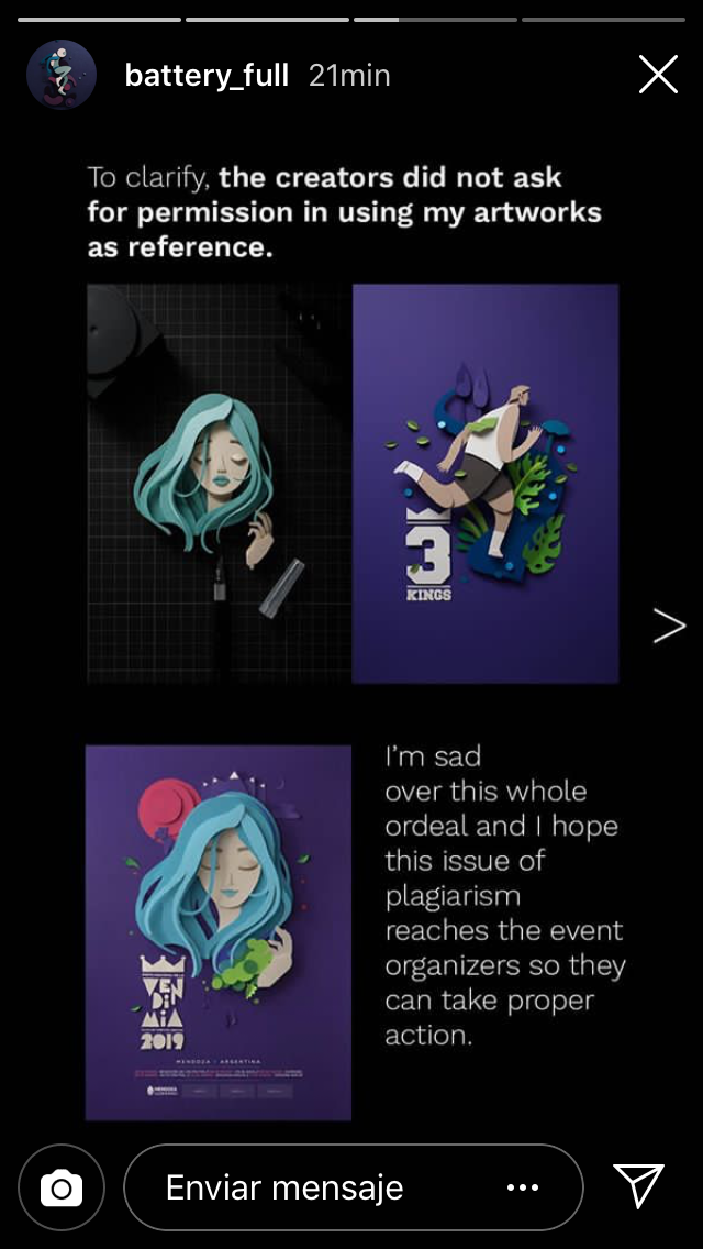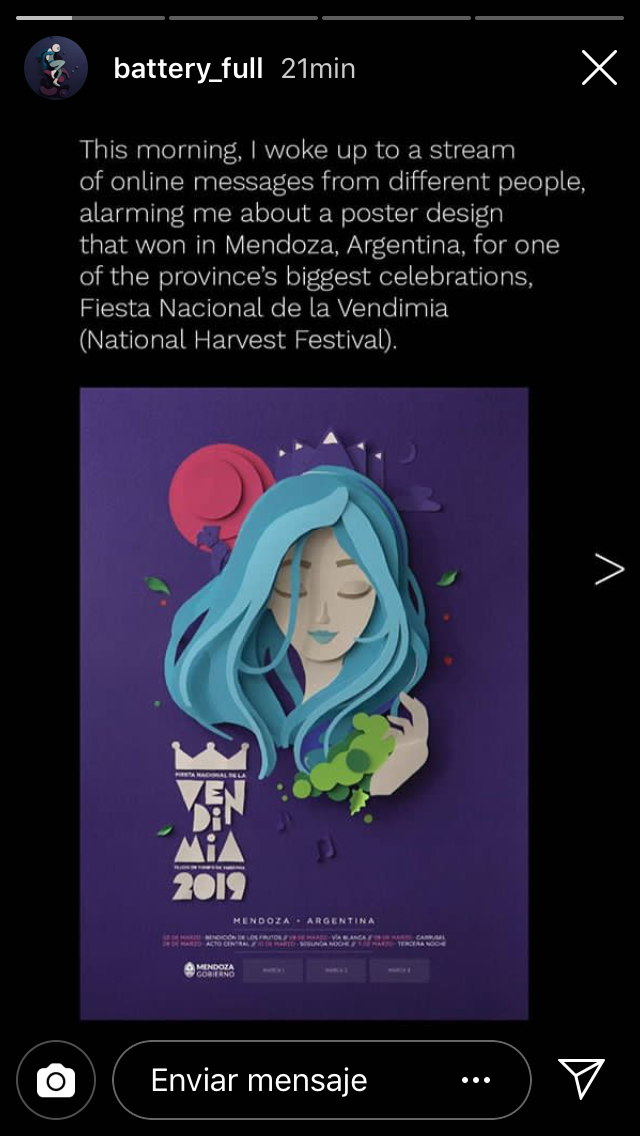 Posteriormente, De Vera publicó una serie de historias en Instagram. "Esta mañana, me desperté con un torrente de mensajes de distintas personas alarmándome acerca del diseño de un poster ganador en Mendoza, Argentina, para una de las celebraciones más grandes de la provincia".