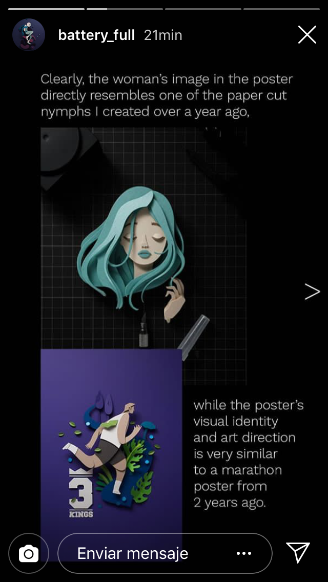 "Claramente, la imagen de la mujer directamente se parece a una de las ninfas en "paper cut" (el estilo de diseño utilizado) que creé hace más de un año y, además, la identidad visual del poster y la direcciónd e arte es muy similar al poster de una maratón de hace dos años", señaló.