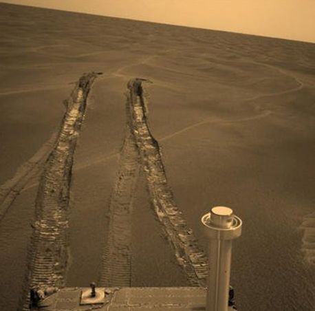 Escapando de una duna. Imagen que muestra cómo el Opportunity escapó de la trampa de arena que suponía la duna Purgatorio, el 26 de abril de 2005.