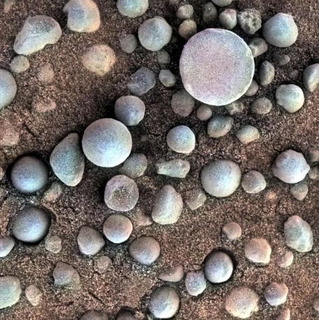 'Arándanos marcianos'. Estas esférulas rocosas, ricas en hematita, se conocen con el apodo de 'arándanos marcianos' y fueron otro de los grandes hallazgos del Opportunity.