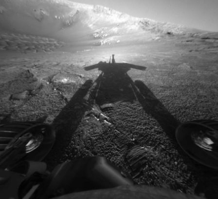 La sombra del Opportunity. El Opportunity fotografió su sombra cuando puso rumbo al Cráter de Resistencia, en la superficie de Marte.
