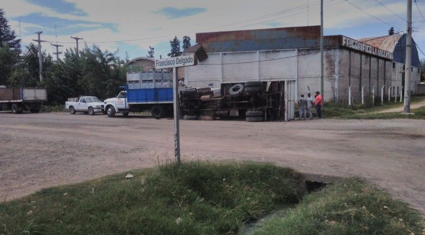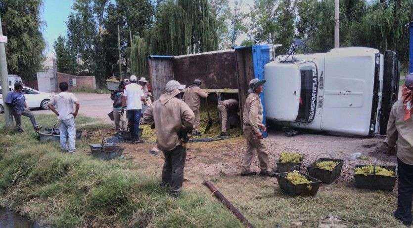 Un camión que transportaba bins con uvas volcó esta tarde en la intersección de calle La Argentina con Francisco Delgado en el departamento de Tunuyán.