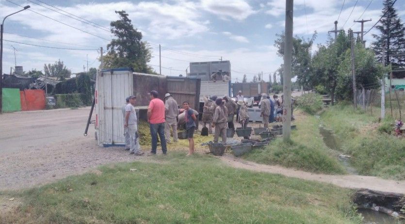 Varios vecinos de la zona se acercaron para socorrer al conductor y traspasar la mercadería a otro rodado.