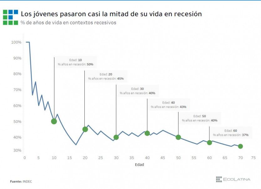 Un argentino de 30 años pasó el 40% de su vida en recesión, y uno de 20 atravesó casi la mitad de su vida en esa condición, mientras desde 1950 el 35% de los años fueron recesivos en el país.