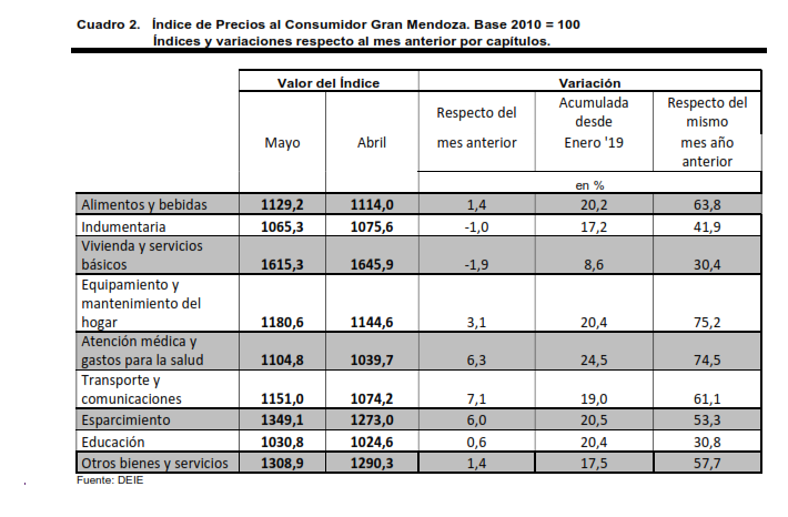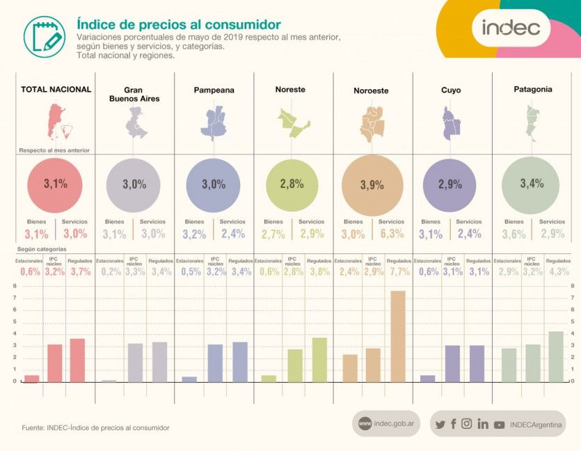 Mientras que a nivel nacional, los precios minoristas registraron en mayo un aumento del 3,1% respecto de abril, y acumularon en los primeros cinco meses del año un alza del 19,2%, informó hoy el INDEC.