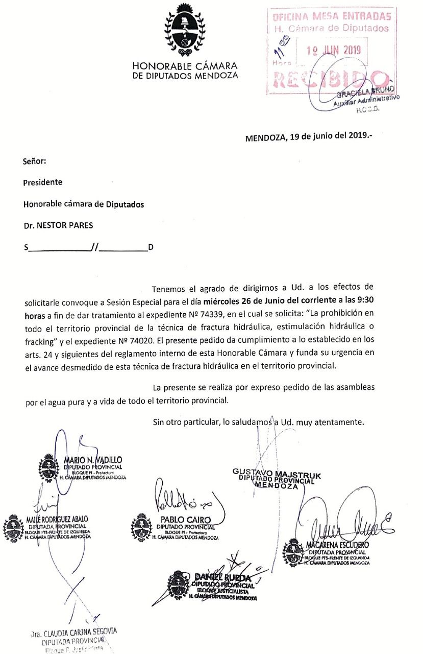 La última semana, Mario Vadillo y Pablo Cairo por Protectora; Mailé Rodríguez y Macarena Escudero por el FIT y Daniel Rued y Gustavo Majstruk por el PJ enviaron una nota al presidente de la Cámara Baja provincial, Néstor Parés. En la misma, se solicitó la convocatoria a sesión especial para este miércoles a las 9.30 con el objetivo de discutir dos expedientes, los cuales apuntaban a que la técnica de fractura hidráulica (fracking) no se utilizara en Mendoza.