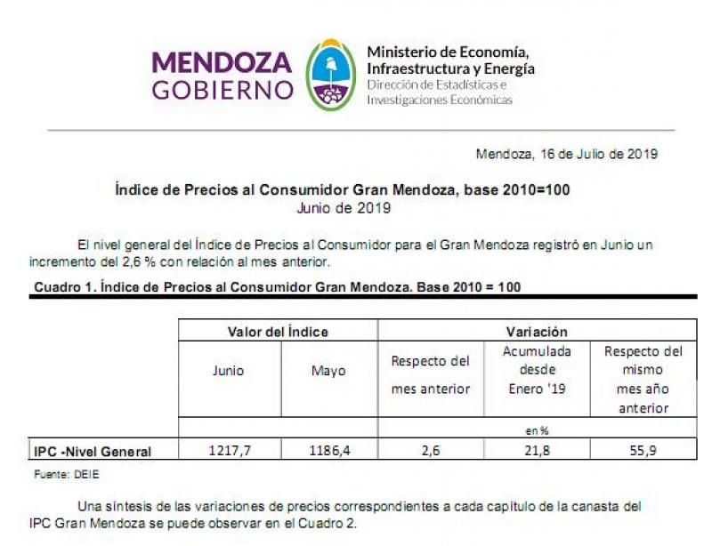 El Índice de Precios al Consumidor para el Gran Mendoza registró en junio un incremento de 2,6% en relación con el mes anterior, según la medición realizada por la Dirección de Estadísticas e Investigaciones Económicas provincial (DEIE).