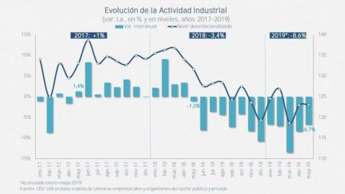 El centro de estudios de la Unión Industrial Argentina determino que en el mismo mes que los bancos rebalsaron sus arcas la actividad industrial se contrajo un 6,7 por ciento acumulando 8,7 en los primeros cinco meses del 2019