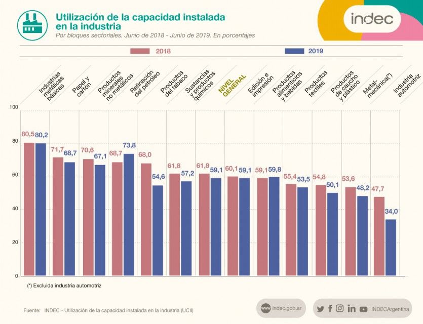 Como consecuencia de la recesión, el uso de la capacidad instalada de la industria volvió a caer en junio, al 59,1%, mientras en el caso de las automotrices bajó al 34%, el peor resultado del sector, informó el INDEC.