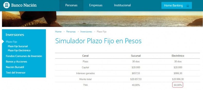 Con el Banco Nación a la cabeza, la tasa que hoy pagan los depósitos a Plazo Fijo a 30 días saltó al 60% anual cuando hasta hace un día la tasa promedio era del 50%.