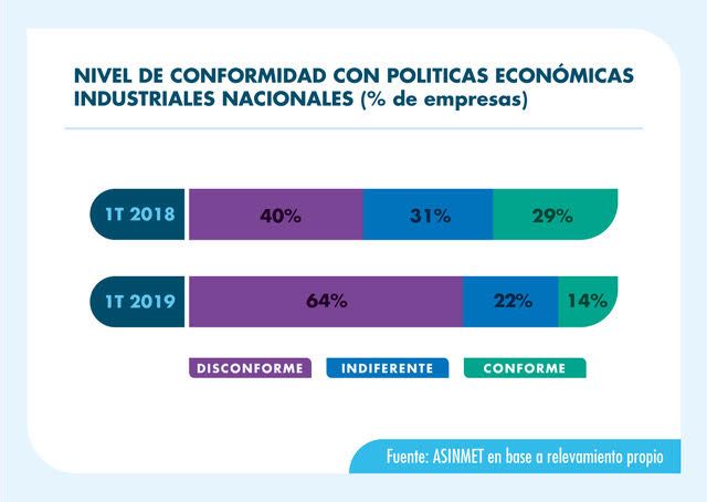 Otro dato a destacar es lo que tiene que ver con el sentir del empresario matalmecánico y metalúrgico mendocino respecto a las políticas económicas e industriales del Gobierno nacional. Mientras en el 1º trimestre del 2018 el nivel de desconformidad llegaba a 40%, en el mismo periodo del 2019, ese número se ubicó en 64%.