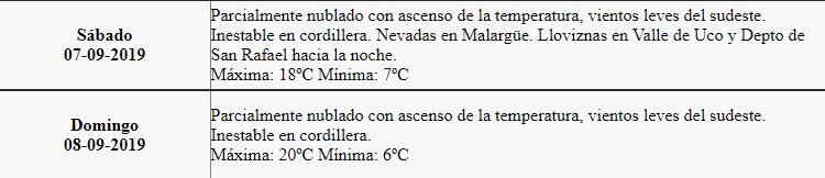 Para el domingo se espera que el cielo esté parcialmente nublado, con vientos leves del sudeste e inestable en cordillera.