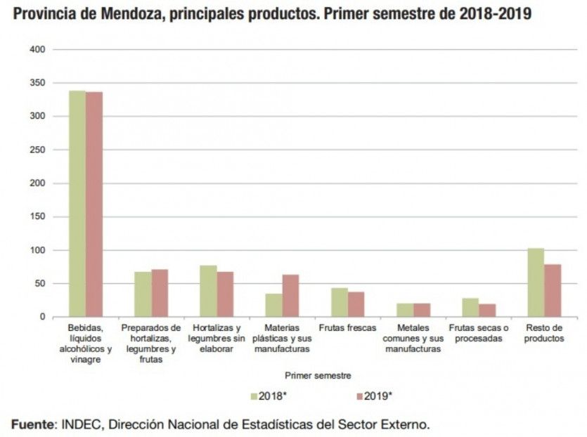 En el primer semestre de 2019 Mendoza registró ventas al exterior por U$S696 millones, con una disminución interanual de 2,7%, que abarcaron el 42,8% de las exportaciones de la región. Los principales productos exportados fueron vinos de uva, que representaron 47,8% del total exportado por la provincia; preparados de hortalizas, legumbres y frutas, con una participación de 10,3% y un crecimiento de 4,4%; y hortalizas y legumbres sin elaborar, que alcanzó 9,7% del total exportado provincial. Los principales destinos de sus exportaciones fueron NAFTA, Mercosur y Unión Europea.