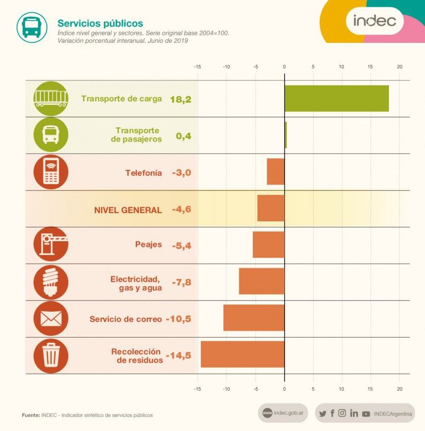 "En junio de 2019 respecto a igual mes del año anterior, la demanda de energía eléctrica, gas y agua registró una caída de 7,8%: la recolección de residuos tuvo una contracción de 14,5%" pero por otra parte, según las cifras del Indec, "el transporte registró un aumento interanual de 0,4% y 18,2% para el transporte de pasajeros y de carga, respectivamente; los vehículos pasantes pagos por peajes se contrajeron 5,4%; el servicio de correo postal tuvo una disminución de 10,5%", mientras que la "telefonía registró un descenso de 3,0%".