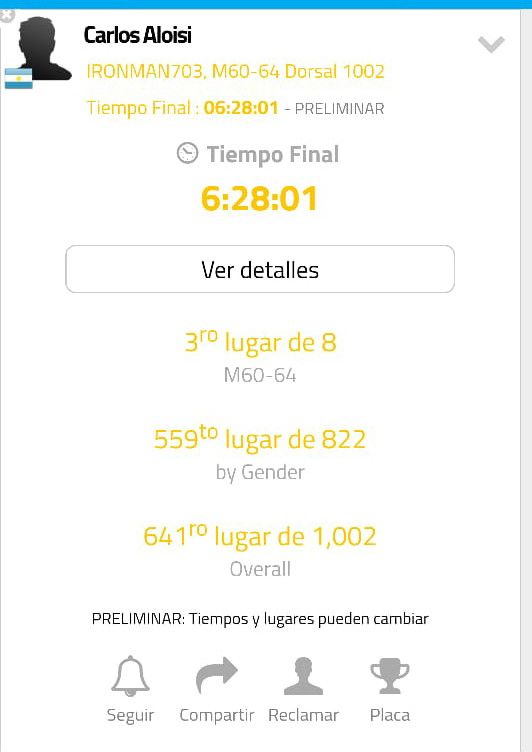 El Doctor se ubicó tercero en su categoría de 60 a 64 años y festejó una excelente carrera, en la cual pudo hacerse del tercer lugar. Quedó a sólo 2 minutos del segundo, aunque la mala noticia es que no le alcanzó para clasificar al Mundial de la especialidad.
