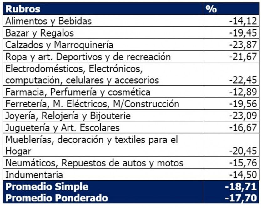 Las caídas anuales más profundas en agosto se registraron en los siguiente rubros: Calzados y Marroquinería (-23,87 %), Joyería, Relojería y Bijouterie (-23,09 %), Electrodomésticos, Electrónicos, Computación, Celulares y Accesorios (-22,45 %), Ropa y Artículos Deportivos y de Recreación (-21,67) y Mueblerías, decoración y textiles para el Hogar (-20,45 %).